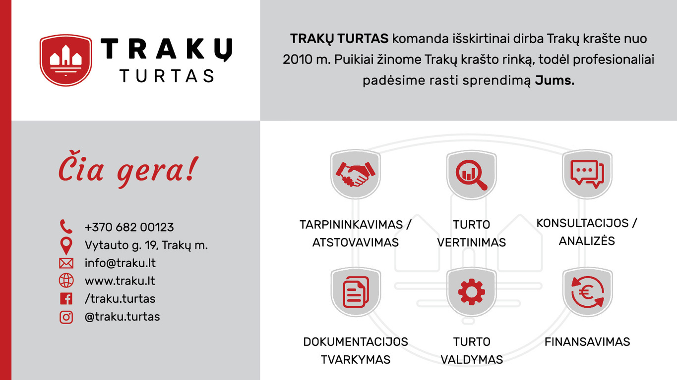 • TRAKŲ TURTAS komanda išskirtinai dirba Trakų krašte nuo 2010 m. Puikiai žinome Trakų krašto rinką, todėl profesionaliai padėsime rasti sprendimą Jums.