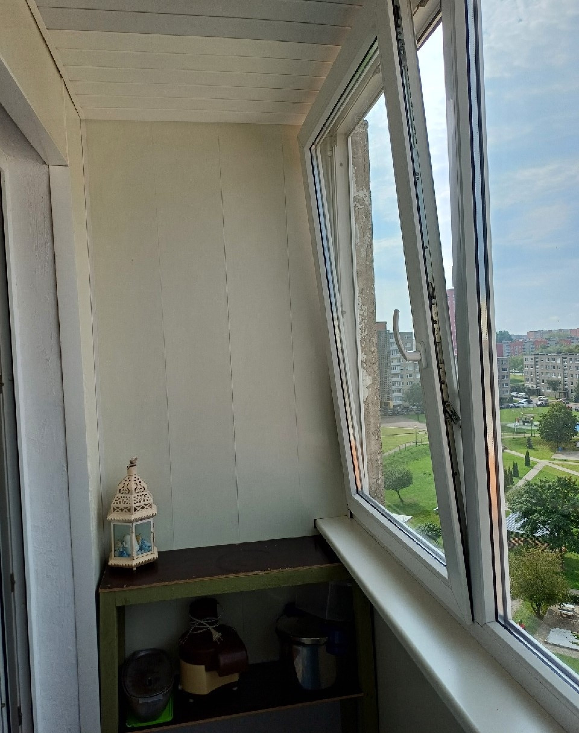 Parduodamas erdvus ir šviesus3 kambarių butasdevintame aukšte (9/9). Butas patogaus išplanavimo - yra du balkonai, vienas iš jųįstiklintas.