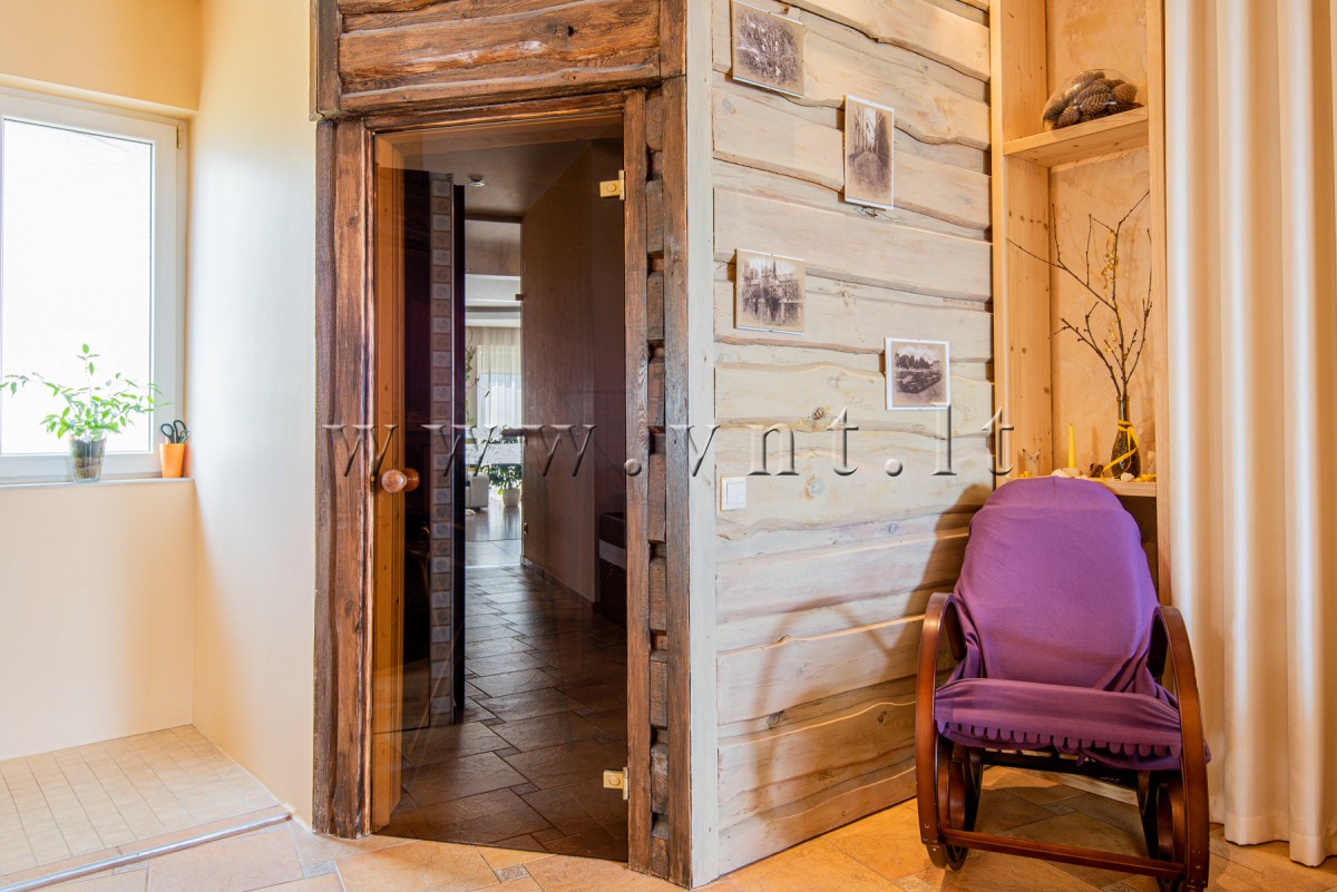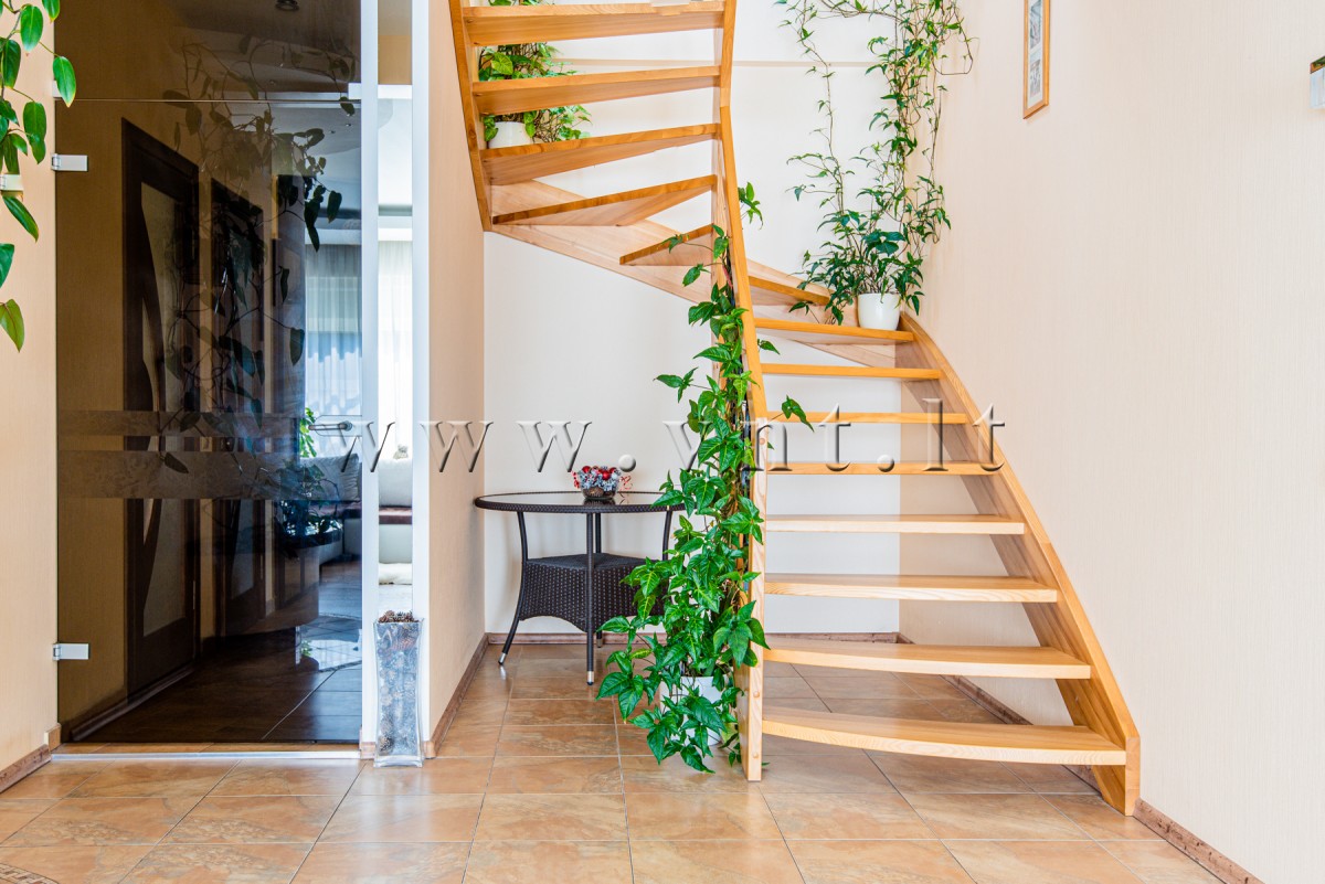 Pirmas aukštas: Bendra svetainės ir virtuvės erdvė su išėjimu į terasą, židinys, tualetas, pirtis su dideliu priešpirčiu, dušas, 34 m2 ploto garažas (perdarytas į pagalbinę patalpą). Antras aukštas: trys miegamieji kambariai, balkonas, vonios kambarys, didelė, apie 10 m2 ploto rūbinė su stoglangiu.