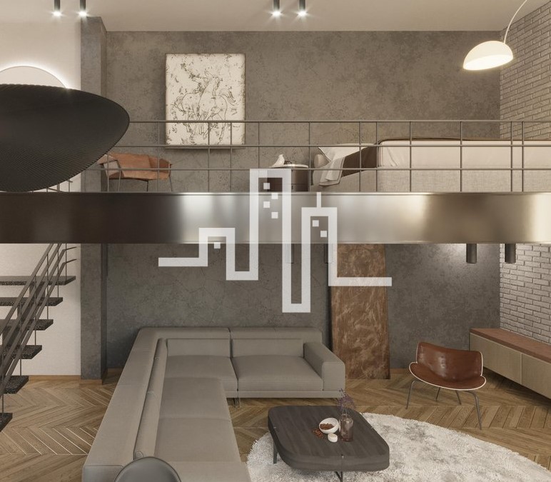 Loftas su antrasolėmis. Antrasolių patalpų aukštis 2.50m. Bendras lofto aukštis nuo 5.50 m. iki 6.38 m.