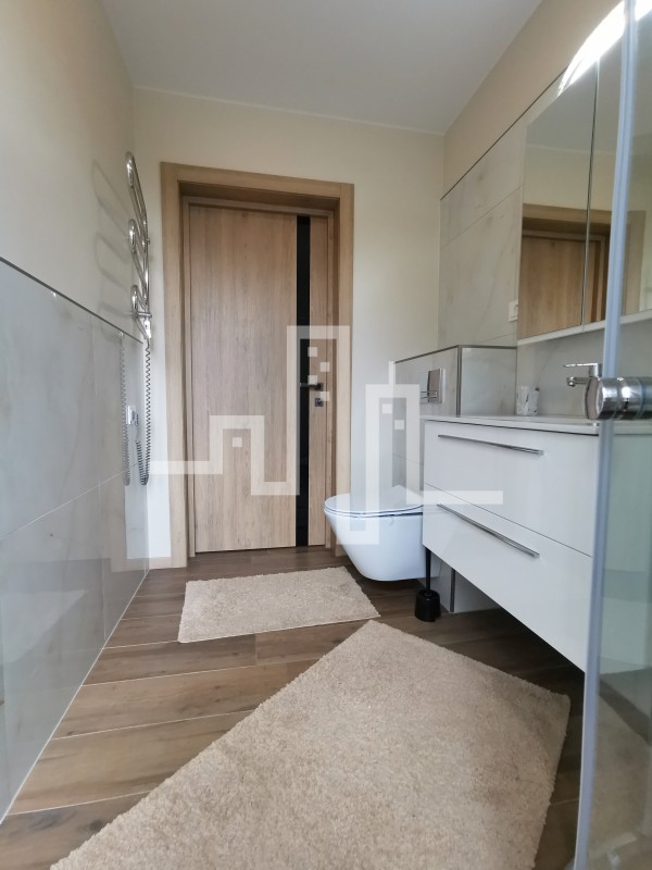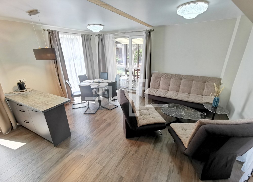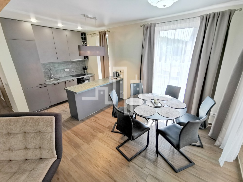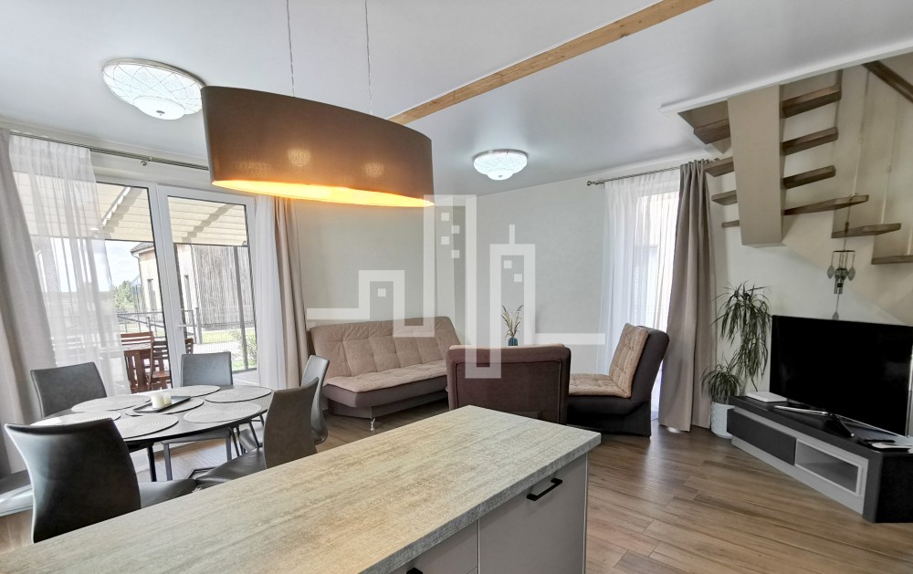 Namas pilnai įrengtas, parduodamas su visais baldais bei buitine technika. Pirmąjame aukšte yra erdvus holas, katilinė, san mazgas, virtuvė, svetainė ir didelė erdvi terasa. Terasa yra stiklinta, tad laiką joje smagu leisti tiek vasarą, tiek vėsesniu oru ar rudens pavasario sezono metu. Į antrą aukštą veda patogūs laiptai. Čia įrengtas kondicionierius, kuris yra galingas ir gerai atvėsina patalpas. Antrame aukšte gerai išplanuoti ir įrengti trys miegamieji. Du šoniniai miegamieji turi net privačius atskirus san mazgus. Viduriniame miegamajame yra du stoglangiai, iš vieno šoninio miegamojo vaizdas veriasi į vidinę namų komplekso teritoriją, kito miegamojo langai atsiveria į žalią gražų pušyno mišką. Visa teritorija yra apželdinta ir aptverta, naudojami automatiniia vartai. tad labai patogu su mažasi vaikais ir augintiniais. Namas yra kraštinis, tad jau nebus šalia jo jokių statybos darbų ir aplinka išliks tokia graži, kokia yra. Nuo gatvės pusės yra tvarkingai įrengtas trinkelinis parkingas, o taip pat automobilį vieną galimą pasistatyti ir vidinėje teritorijoje prie pat namo. Šalia namo yra sandėliukas, kuriame galima laikyti dviračius, grilį ir kitus reikalingus daiktus.