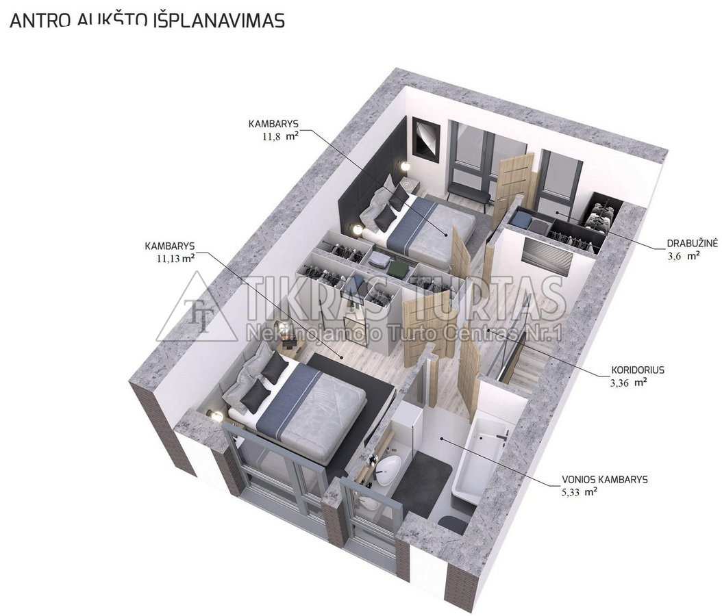 • 2 aukštai, 3 kambariai (2 miegamieji).