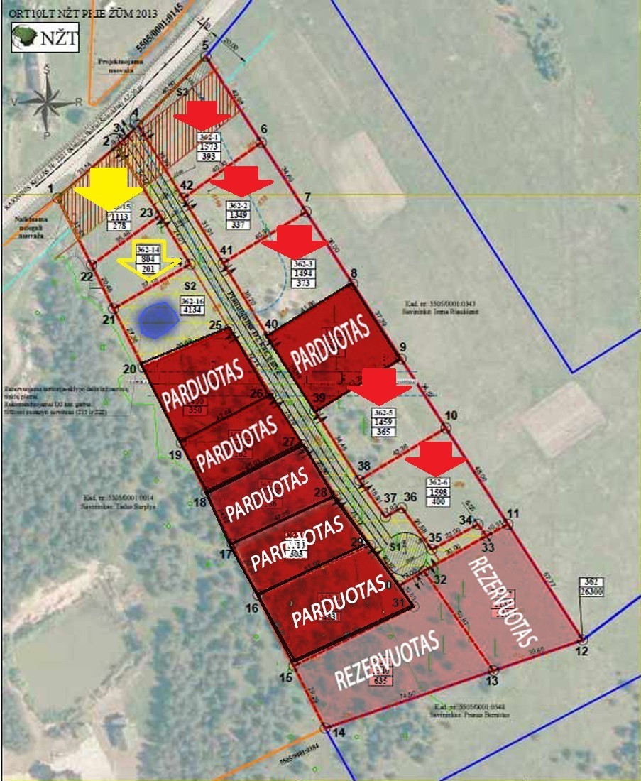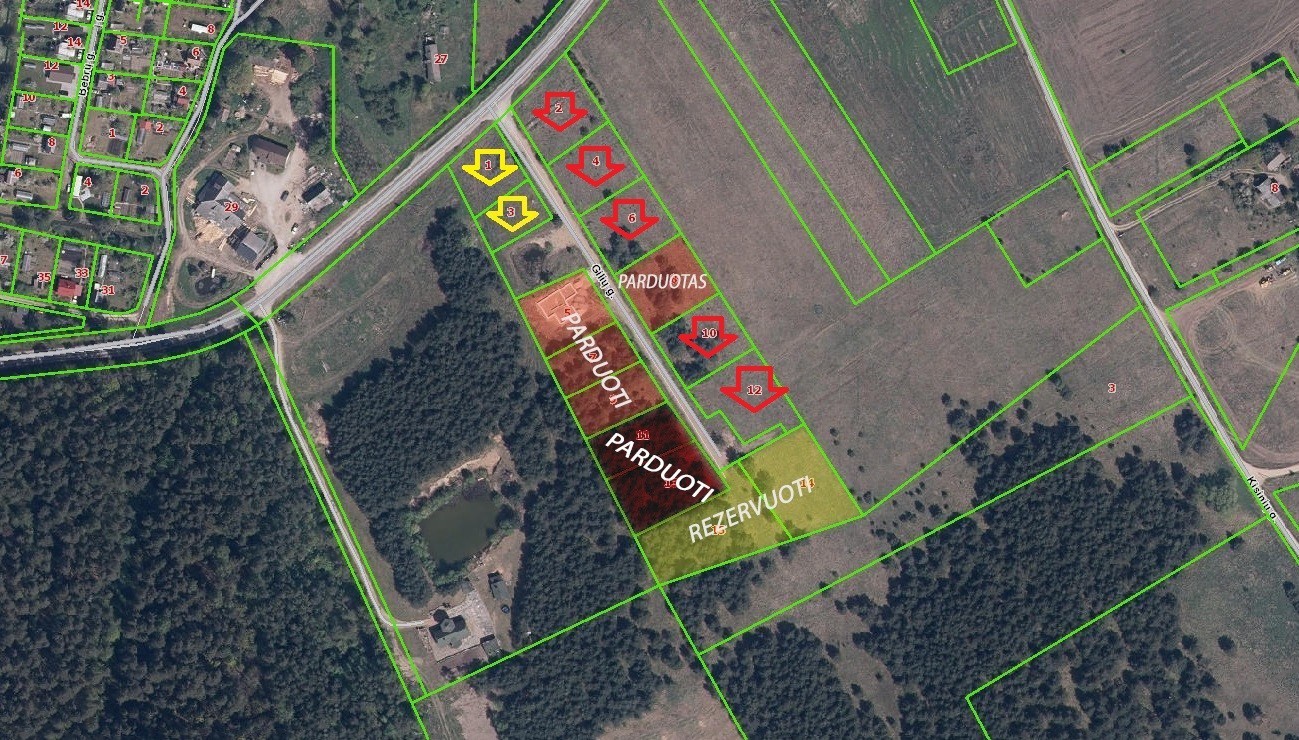 Klaipedos r. Kisiniuose, Gilių g. PARDUODAMAS 15.98 aro sklypas už 27200 eurų. Yra galimybė rinktis iš likusių 7 sklupų skirtingu dydžių ir plotų nuo 8 iki 25.4 aro, kurių vieno aro kaina nuo 1700 iki 2200 eurų už vieną arą. Iš parduodamų 15 sklypų namų statybai, ŠEŠI sklypai parduoti ir du rezervuoti. Like 7 sklypų įvairaus dydžio, ploto ir kainos: Mažieji sklypai: (geltona rodyklė) Gilių g.3 (8.04 aro); Gilių g.1 (11.13 aro) vieno aro pardavimo kaina 2200 eurų. Didieji sklypai: (raudona rodyklė) Gilių g.2 (15.73 a); Gilių g.4 (13.49 a); Gilių g.6 (14.94 a); Gilių g.10 (14.59 a); Gilių g.12 (15.98 a) vieno aro pardavimo kaina 1700 eurų (Pridedami parduodamų sklypu planai). Bendras Elektra įvesta į kvartala; nuotekos vietinės; vandentiekis - vietinis; Išpiltas kieto grunto statybinis kelias. KOMUNIKACIJOS: Elektra; - Įvesta į kvartalą. (Prie įsigytų sklypų, naujas savininkas užsisako elektros įvada iš centralizuotų elektros tiekėju) Vandentiekis: (vandens gręžinys Į KAINA NEISKAIČIUOTAS); Nuotekos (fekalas) – vietinis valymo irenginys; Lietaus kanalizacija – sklype įrengtos valstybei prikausančios melioracijos sistemos iškastas prišgaisrinis tvenkinys. Kieto grunto statybinis kelias PAPILDOMA INFORMACIJA: Projektas: Yra patvirtintas detalusis projekto planas ir įregistruota dalis sklypų Registrų centre. Sklypų užstatymo tankis – 0.10 ~0.25 Sklypų užstatymo intensivumas – 0.50 ~ 0.60 Leistinas maksimalus pastatų aukštis ~ 10 m; Sklypai įregistruoti Registrų centre. Suteiktas 'GILIŲ' gatvės pavadinimas ir sklypų numeracija. NT REGISTRO CENTRO IŠRAŠO DUOMENYS: Pagrindinė naudojimo paskirtis: Kita Naudojimo būdas: Gyvenamosios teritorijos Mažaukščių gyvenamųjų namų statybos Kadasrtinė vietovė: Baičių k.v. Bendras kvartalo plotas: 2,6300 ha Namų valdos naudingas plotas: 2.2166 ha Kelio ir komunikacijų bendras plotas: 0.4134 ha Žemės sklype įrengtos valstybei prikausančios melioracijos sistemos bei įrenginiai 2,63 ha Matavimų tipas: Žemės sklypas suformuotas atliekant kadastrinius matavimus Servitutas- teisė aptarnauti požemines, antžemines komunikacijas PRIVALUMAI: Asfaltuotas privažiavimas. Šernų miškas. ATSTUMAI: Autobuso Nr.11B sustojimas ~ 350 m Dovilų pagrindinė mokykla ~6.5 km Klaipėda (Centrinis paštas) ~ 18 km „Majaro sodyba“ ~ 3.95 km „Rimkų Viadukas“ (Šilutės plentas) ~ 7,15 km Artimiausios gyv. Ketvergiai ~ 2,69 km; Žiaukos ~ 1.65 km; Šernai ~ 2,20km; Dovilai ~6,50 km; Gargždai ~ 10 km; Klaipėda (Rimkai) ~ 9km; PRIVAŽIAVIMAS: Privažiavimas – asfaltuotu Šernai – Dovilai plentu (K. Baltzerio ir Stučių gatvėmis) Maršrutinis Autobusas Nr.11B