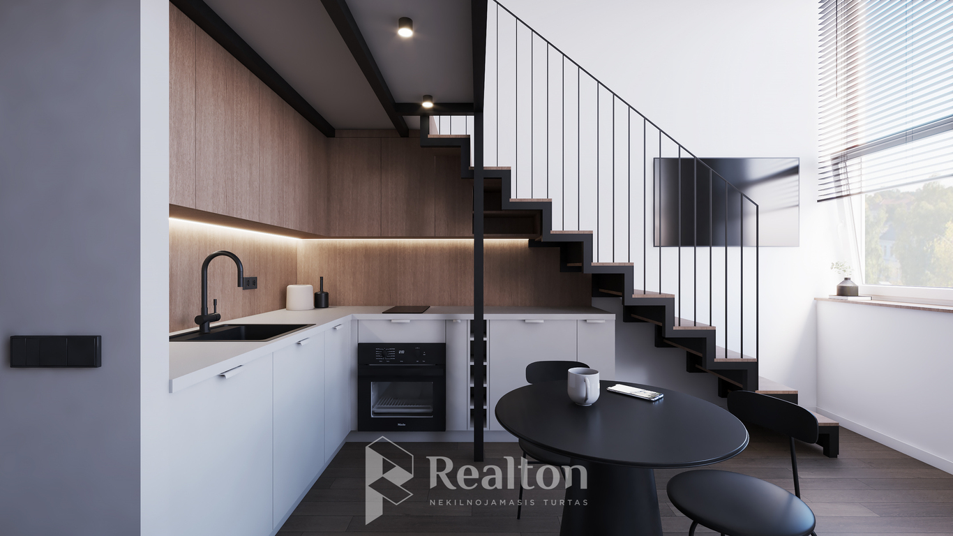-- Virtuvė ir svetainė pirmame aukšte, antrame aukšte miegamasis;