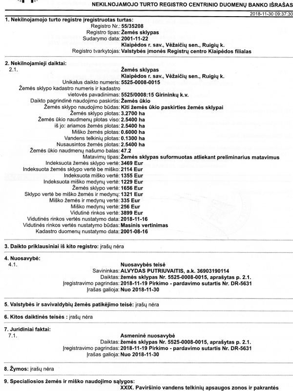 Parduodamas 3.27 ha.žemės sklypas su mišku Ruigių k.Klaipedos raj.,žemės našumo balas 47. Žemės sklypas prižiūrėtas deklaruojamas kaip pieva. Kaina 22000eur. NUOSTABI VIETA VERTINANTIEMS GAMTA ! DAUGIAU ALTERNATYVIŲ PASIŪLYMŲ RASITE ADRESU Reikalinga profesionali pagalba PERKANT ar PARDUODANT nekilnojamąjį turtą - KREIPKITĖS !!! NEMOKAMAI KONSULTACIJAI,SKAMBINKITE 865090890 Investuok į žemę šiandien! Žemė nesensta, negenda, nedega, niekur nepradingsta, yra nedraudžiama. Tai patikima, ilgalaikė ir atsiperkanti investicija, pigesnė nei šiandien vargiai kada dar ar bus.