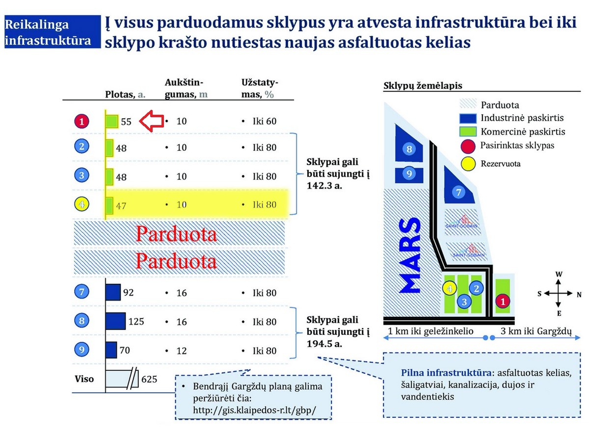 Gargždai Pramonės g. Komercinės paskirties 0.55 ha žemės sklypas Nr. 1 Parduodami 55 arų komercinės paskirties žemės sklypai Gargždų industriniam parke (GIP).Į visus parduodamus sklypus yra atvesta infrastruktūra, bei iki sklypo krašto nutiestas asfaltuotas kelias. Daug pramoninių kompanijų tokių kaip: Mars Lietuva, Lotos, Ruuki, Print IT, Litana, Arlanga, Hidrostatyba ir kt. jau pasirinko vystyti veiklą šalia GIP dėl itin patogaus susisiekimo. Kelios min. kelio iki Gargždų geležinkelio terminalo. Už gero 30 min. kelio yra Klaipėdos Jūrų Uostas ir Tarptautinė Jūrų perkėla, Centrinis Klaipėdos terminalas. Apie 40 min. kelio iki Palangos Oro Uosto – tarptautinis oro uostas Kunigiškiuose, prie kelio A13 Klaipėda–Liepoja. 7 km nuo Palangos centro, 32 km nuo Klaipėdos, 17 km nuo Kretingos. Iš Palangos ir Klaipėdos į oro uostą veža autobusai. Oro uostas pritaikytas mažiems ir vidutiniams lėktuvams. Pagrindinė Informacija: Adresas: Gargždai, Pramonės g. 11. Plotas: 0.55 ha. komercinė, pramonės-sandėliavimo. Kaina: 104500 eurų + PVM Komercinės paskirties žemės sklypas Nr.1 Plotas: 5500.00 m² Kaina: 19.00 Eurų/kv.m. + PVM