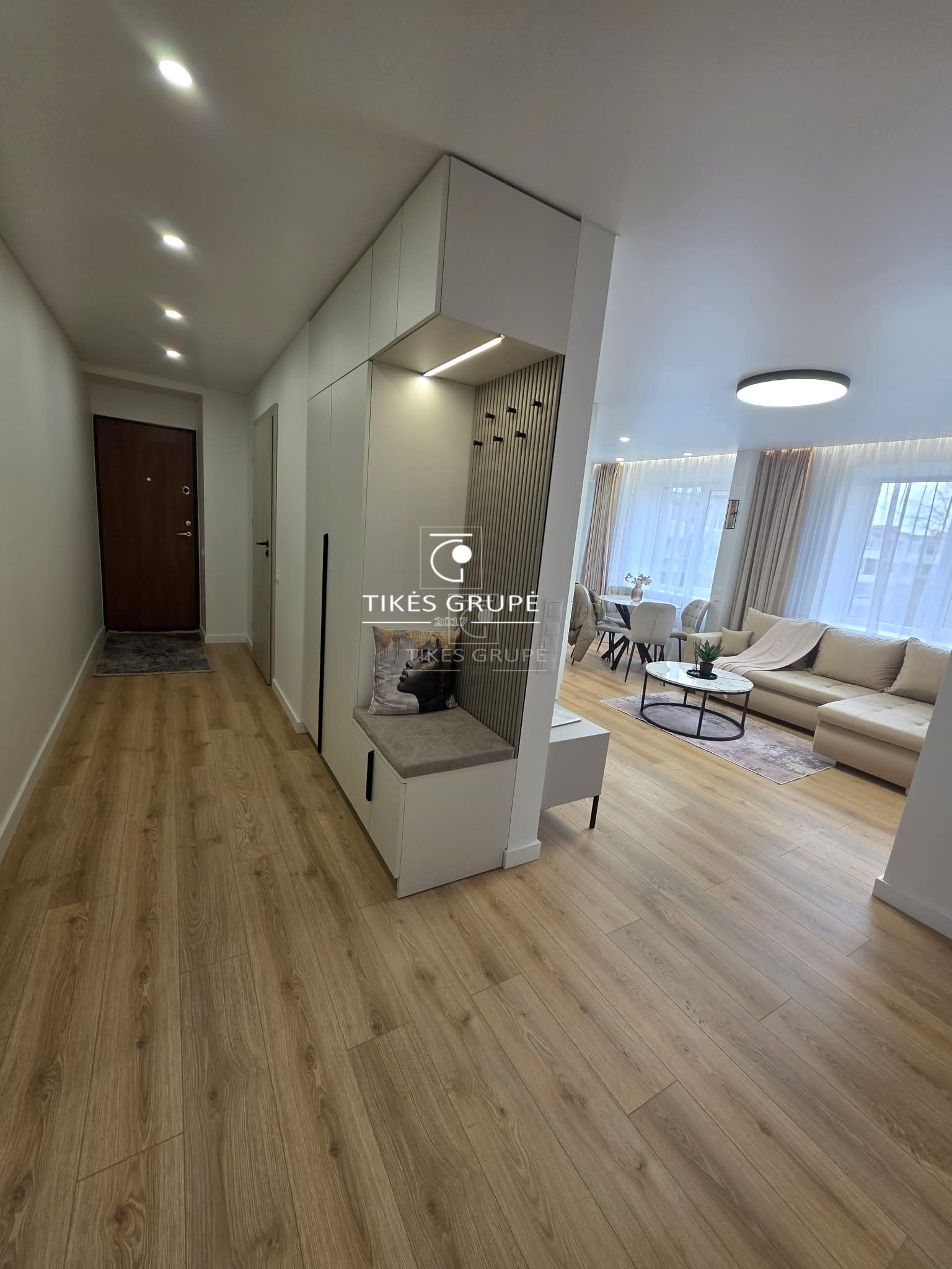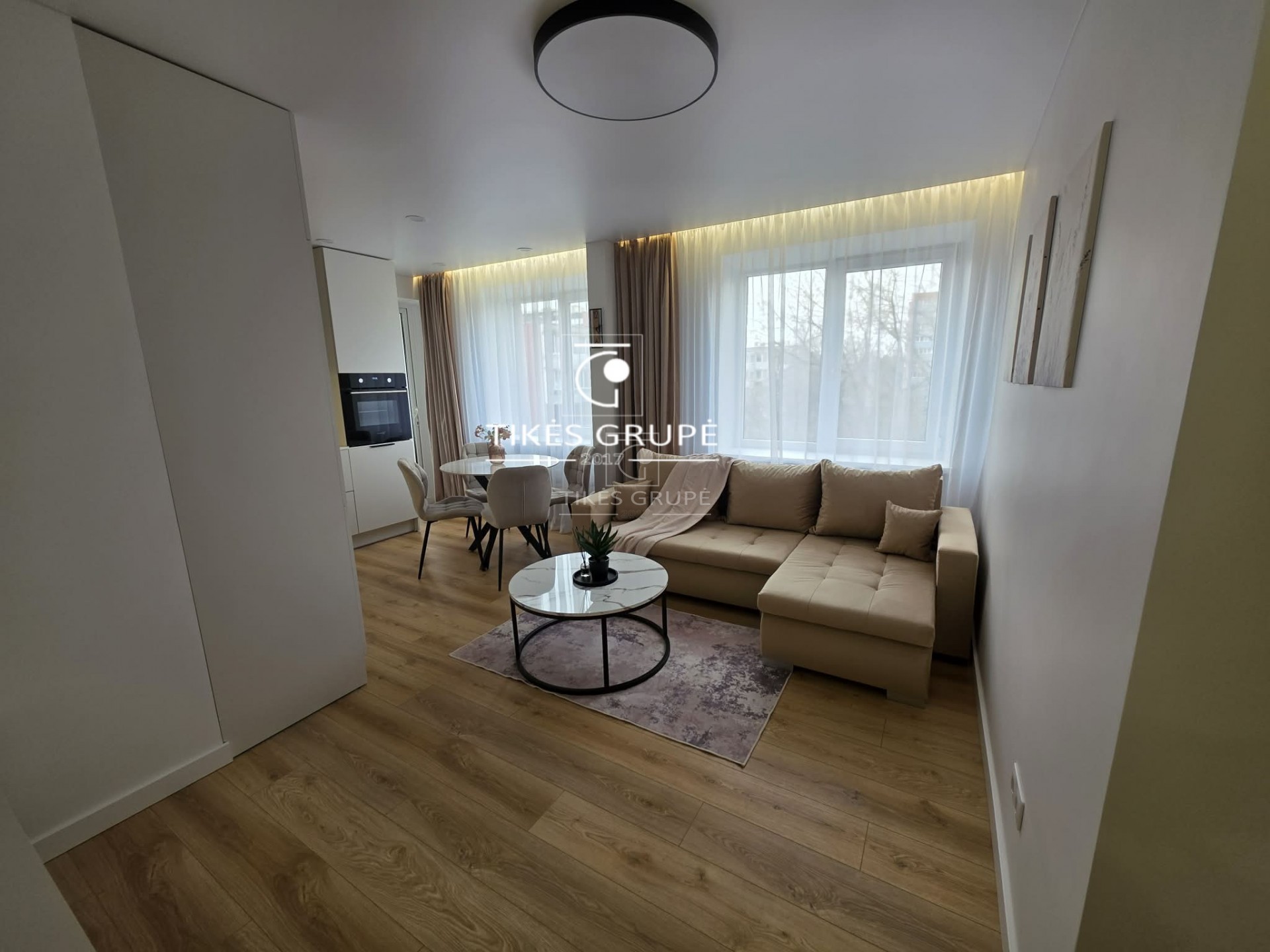 Yra rūsys, langai su stiklo paketais, laminatas, virtuvės baldų komplektas, su baldais, yra buitinė technika, nauja santechnika, šarvuotos durys