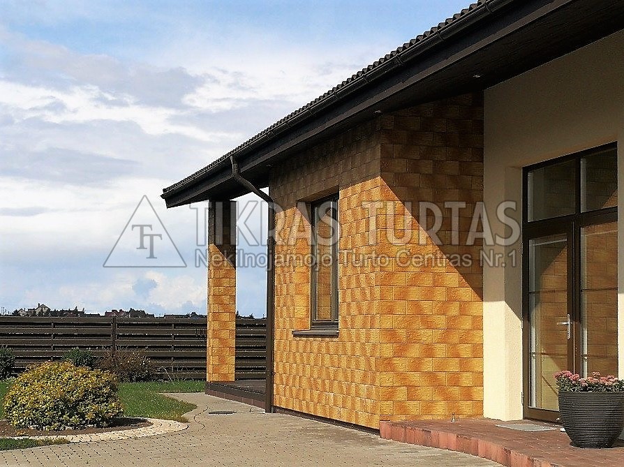 yra terasa, medinė, po stogu; stogo danga – betoninės čerpės. Išorės apdaila – dekoratyvinis tinkas, klijuojamos klinkerinės plytelės; garažas 2 automobiliams.